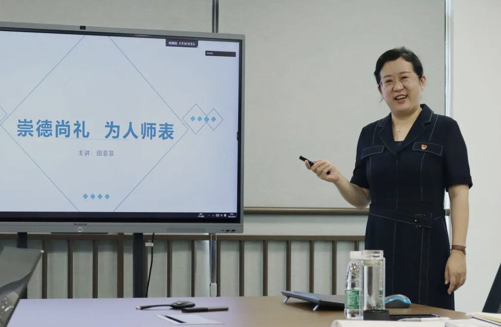 6月20日上午,研究院第三次主题教育专题党课“崇德尚礼 为人师表”由党支部书记田菲菲主讲,研究院全体师生通过线上线下结合的方式参加党课学习。